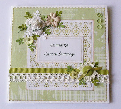Dzisiaj kolejna karteczka z okazji chrzcin z pudełeczkiem do kompletu. Poleci baaardzo daleko :) Ale najważniejsze w niej są prześliczne szydełkowe kwiatuszki robione przez kochaną Jadzię :) wielkie buziaki dla niej !